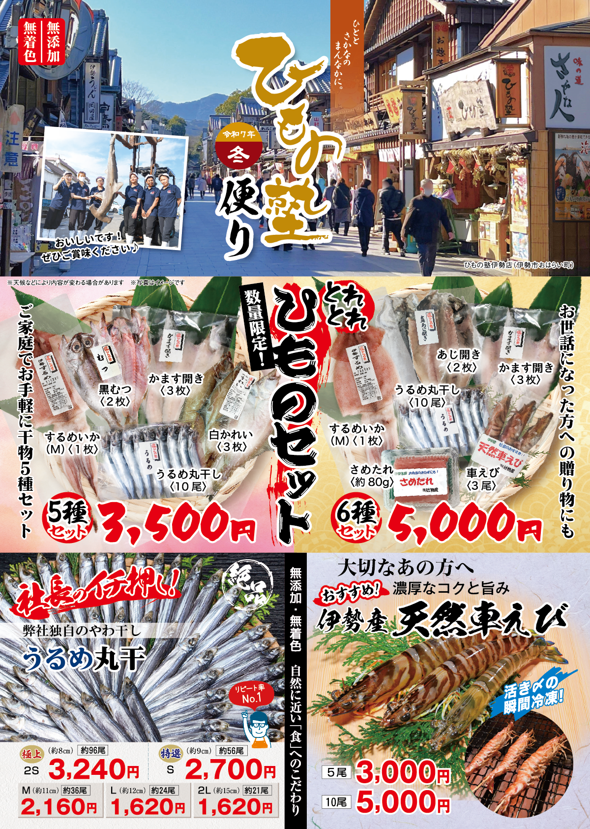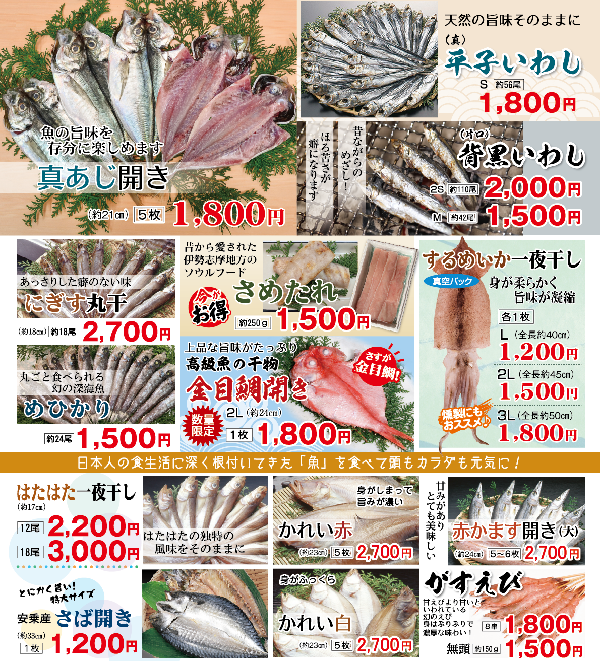 わたしたちの商品は、漁港に水揚げされたところから専任スタッフが吟味して仕入れ、自社で製造・加工し販売する一貫体制です。仕入れ段階から妥協しない上に、水揚げ量などの条件により左右されるため、品切れになることも頻繁にございます。また、季節により在庫がない場合もございますので、ご購入の際は必ずお問い合わせくださいませ。フリーダイヤル:0120-37-3833